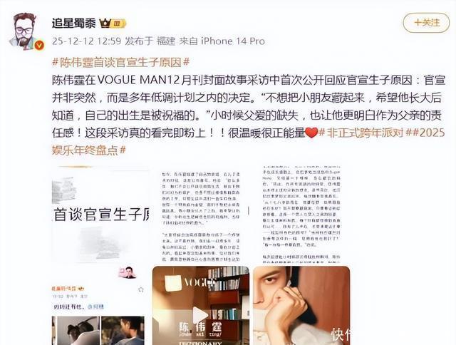 时间回溯至10月18日,演员陈伟霆在社交平台官宣与模特何穗生子,配文简洁而充满力量:“爸爸、妈妈还有他”。没有盛大预告,没有长篇渲染,一如他始终守护私人生活的风格。从银幕上的硬汉到镜头外的慈父,陈伟霆的这次身份转变,或许正是一个男人将深藏多年的温柔,付诸于最平凡也最珍贵的日常。